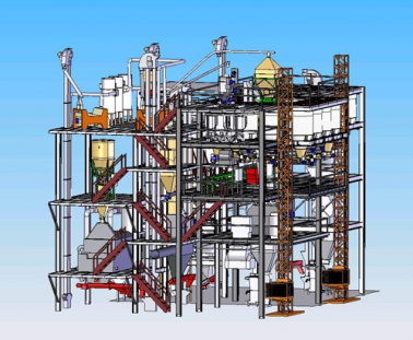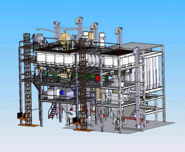 - Технологическое и транспортное оборудование линии компактно размещено на площадках в едином объеме помещения, исключающем влияние перетоков воздуха на работу дозирующего оборудования, характерное для поэтажной компоновки.