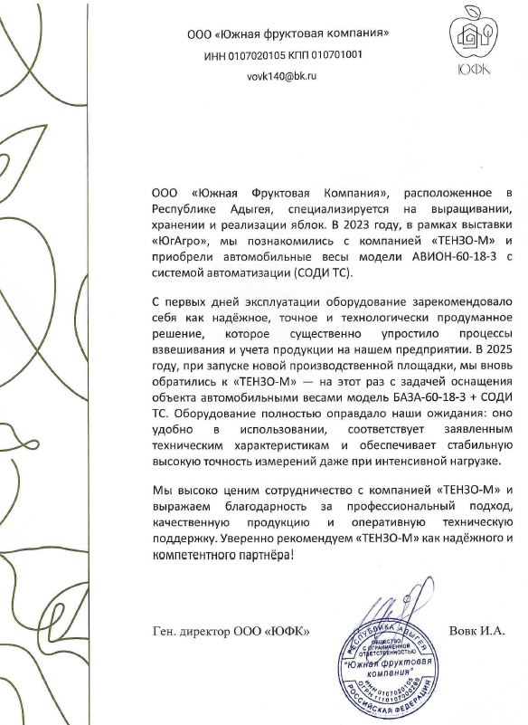 Автомобильные весы «База-60-12» бесперебойно работают, снижая наши временные и финансовые затраты. Точный весовой учет сельхозпродукции позволил существенно повысить прибыльность нашей компании! Рекомендуем «Тензо-М» как надежного и профессионального партнера.