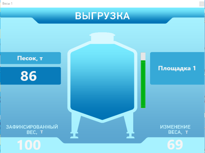 ПО позволяет вести мониторинг состояния весовой системы. На панели визуализации отображаются мнемосхемы бункеров с указанием уровня заполнения емкости, значения текущего веса, наименования продукта и других параметров. Программа собирает данные по всем весовым устройствам, представляет возможность формирования отчётов по продукту, весовому устройству или производственной площадке.